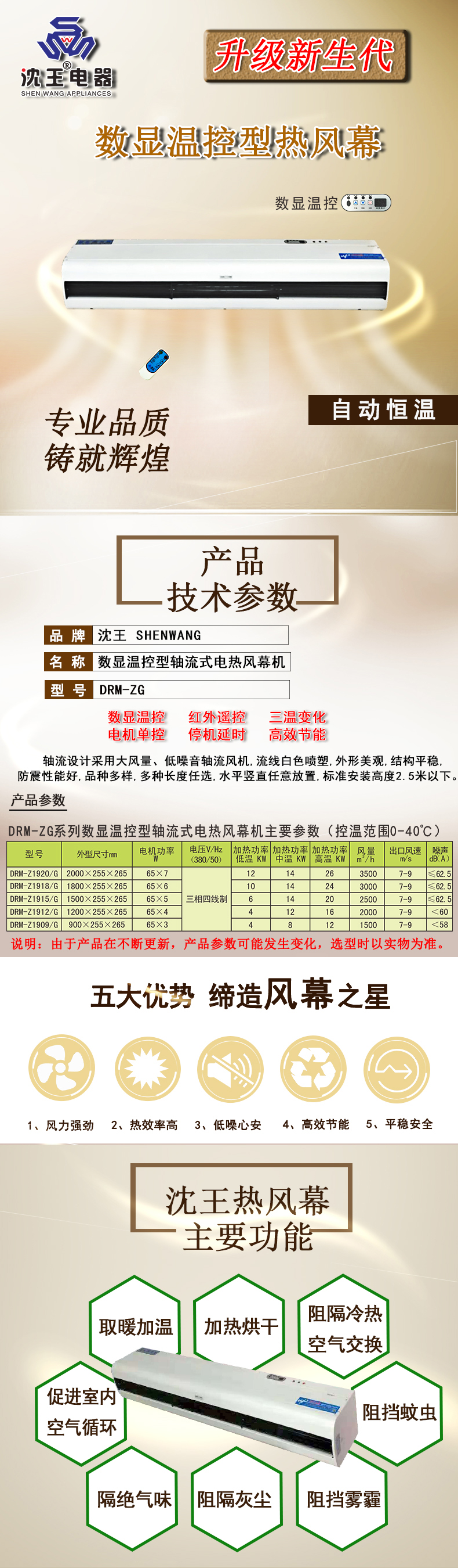 簡介:红外遥控、三温变化、电机单控、高效节能、数显温控、停机延时